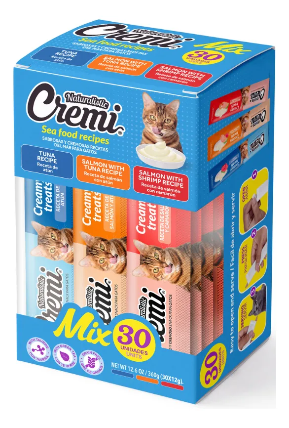 Naturalistic Cremi es un snack cremoso para gatos con salmón, atún y camarón. Alta palatabilidad, textura suave y aporte extra de hidratación. Caja de 30 unidades.